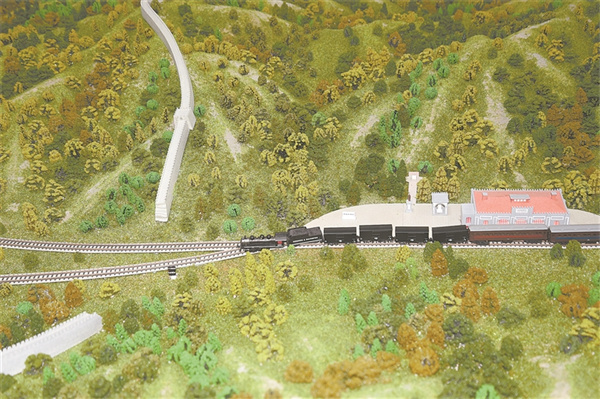 京張鐵路記憶館內(nèi)展陳的京張鐵路“人”字形線路沙盤(pán)。高 磊 攝