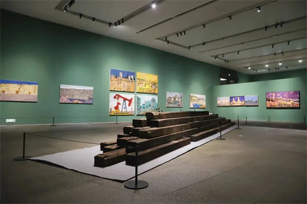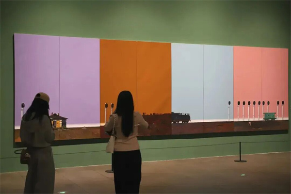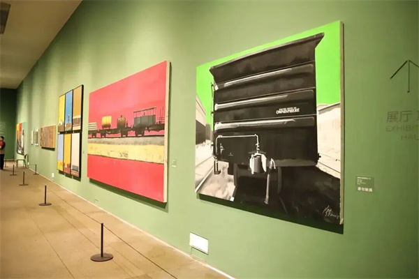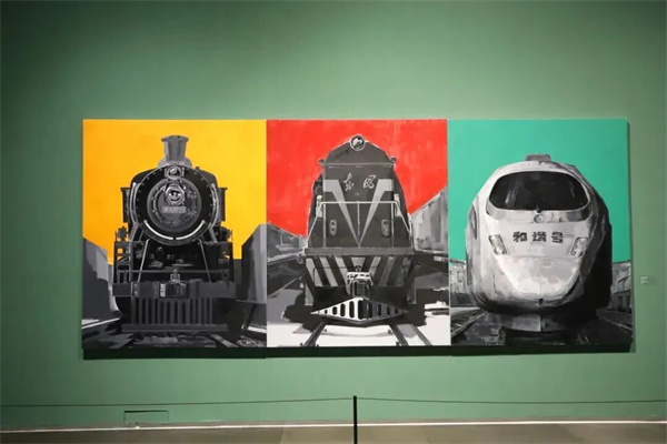 序廳以《奔騰·歲月》開篇,描繪中國鐵路發(fā)展的重要階段。作品中的機(jī)車主體以黑、白、灰為主色調(diào),盡顯硬朗雄厚的力量感;而背景的紅、黃、綠三種高飽和度純色,則為機(jī)械的冰冷感賦予了強(qiáng)烈的當(dāng)代視覺沖擊力。觀眾得以從中國鐵路的巨變中,真切感受到中國的飛速發(fā)展和時(shí)代變遷。