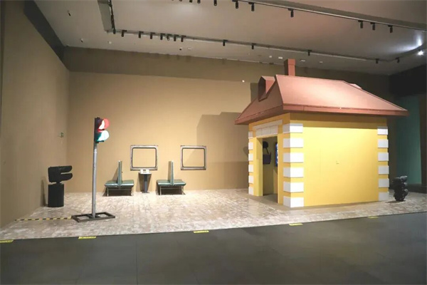 展廳中,一件名為《站臺》的大型裝置作品尤為引人注目。作品以東北地區(qū)火車扳道房為原型,淺紅褐色屋頂與赭石色墻體復(fù)刻了工業(yè)記憶,地面如白雪覆蓋,搭配綠皮火車座椅、茶幾與模擬車窗,再輔以信號燈的光影點(diǎn)綴,讓每一位觀眾都能成為這段旅途中的風(fēng)景,完美詮釋了“場域性景觀”的藝術(shù)構(gòu)想。